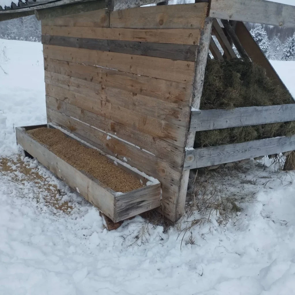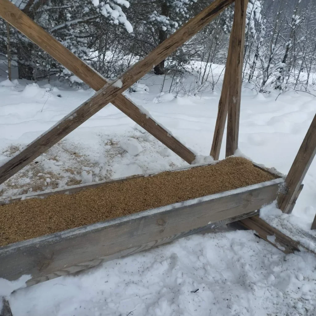 Чтобы дикие животные благополучно перезимовали, работники охотхозяйства готовятся еще с лета: заготавливают сено, зерновые смеси и сочные корма.